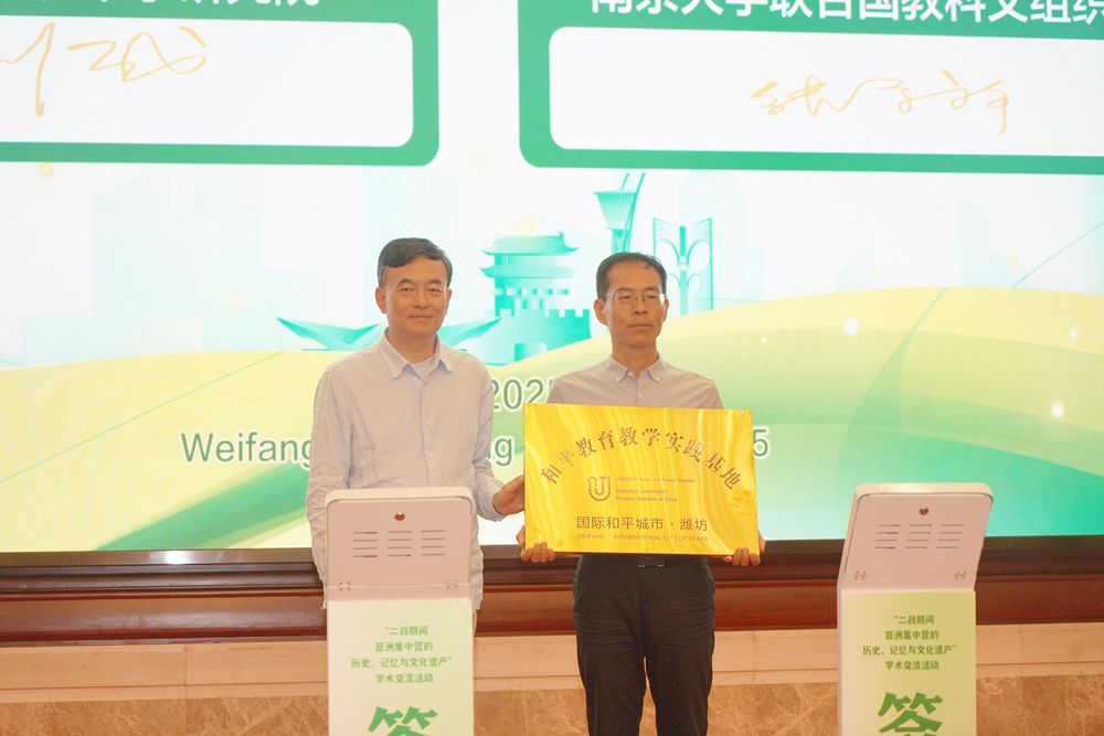 活动期间,和平学院研究院与南京大学联合国教科文组织和平学教席签订合作协议,南京大学刘成教授授予潍坊学院“国际和平城市·潍坊和平教育教学实践基地”牌匾。这一战略合作极大提升了学院的学术地位,拓宽了合作平台,为学院在和平学研究、和平教育实践及国际传播领域实现跨越式发展奠定坚实基础。