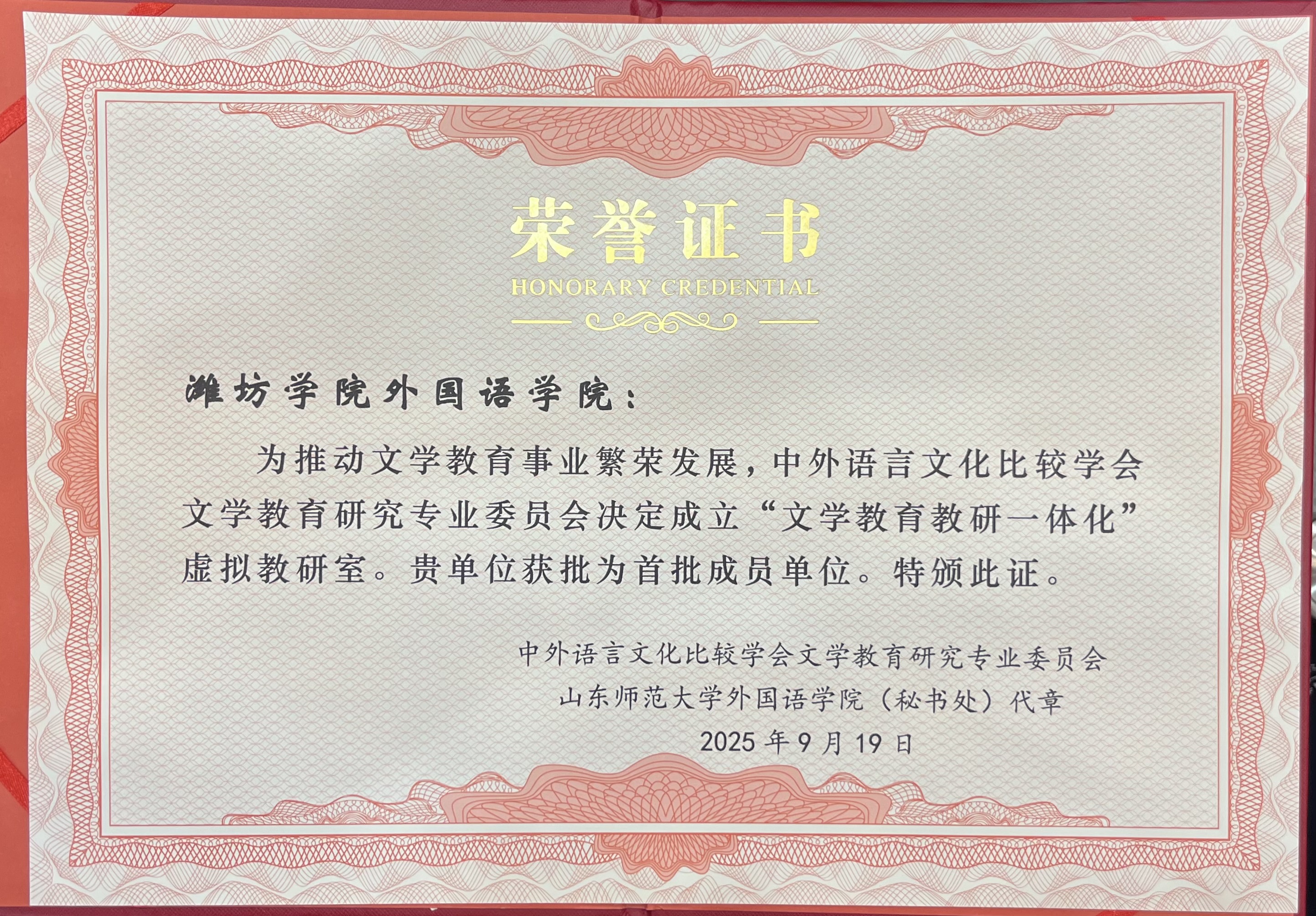开幕式上,举行“文学教育”教研一体化虚拟教研室启动仪式,我院入选成员单位。来自全国百余高校的线上线下虚拟教研室成员参会,仪式由山东师范大学外国语学院王卓院长主持,北京外国语大学金莉教授致辞并为各高校虚拟教研室负责人颁发证书。会议期间,院长张学祥介绍了潍坊学院和平学研究院的相关情况,分享了文学教育的和平本质等观点。