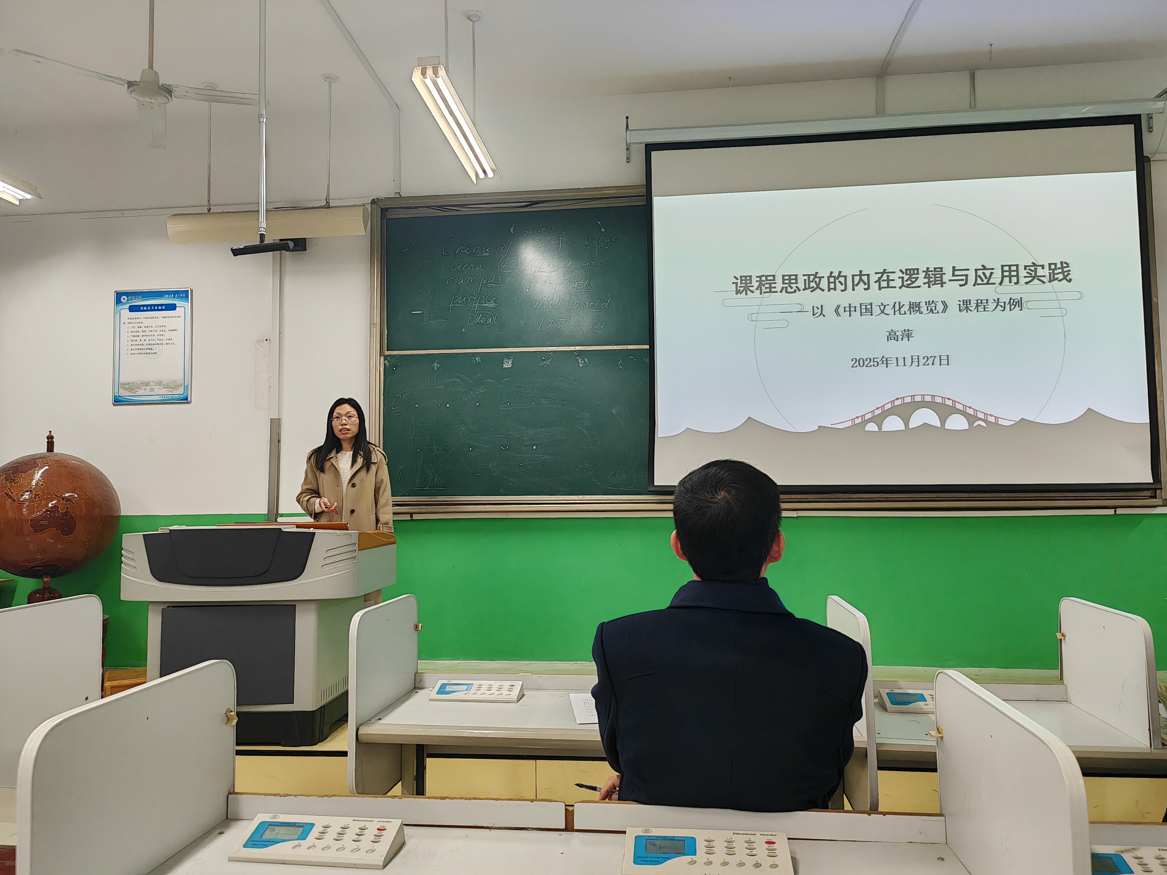活动中,高萍老师以“课题思政的内在逻辑与应用实践”为题作分享。她从课程思政的内在逻辑、专业教学与思政教育的融合路径及师生协同发展三个维度,深入阐释了课程思政作为教育理念、教学策略和育人体系的本质内涵,强调需通过理念引领、理论支撑、实践应用及工具实现多维推进。结合自身讲授的《中国文化概览》课程,她从教、学、评三个层面系统分享了课程思政的应用路径,并探讨了AI在教学评一体化中的辅助功能,提出教师可借助AI构建教学评闭环体系,而思辨能力提升仍需人机协同深度融合。