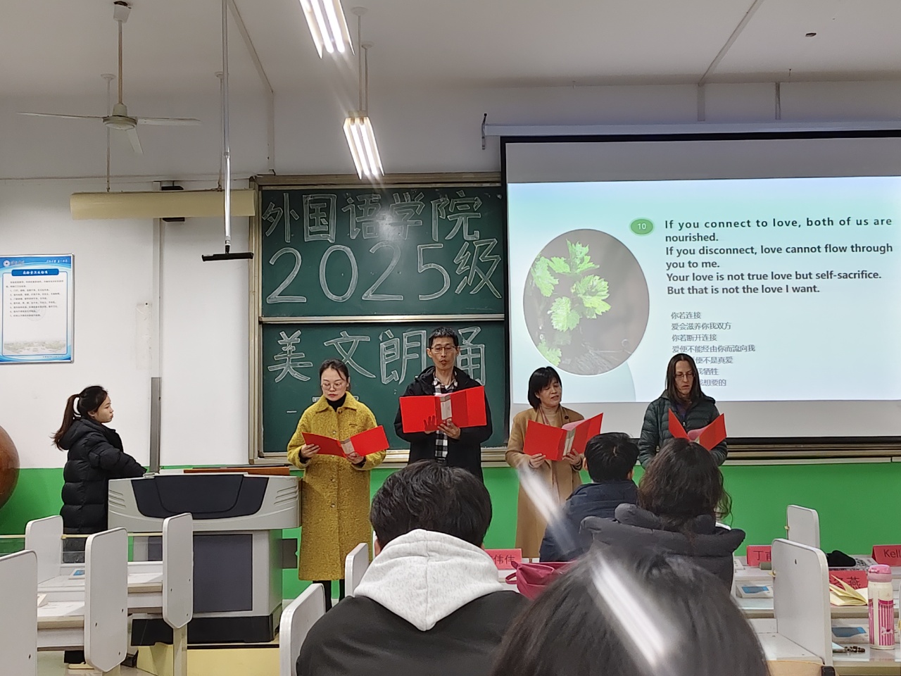 赛后,四位英语专业教师登台献艺,带来了精彩的诗歌朗诵表演。老师们以专业的演绎、深厚的情感传递语言魅力,让同学们更直观地感受英语语言艺术的独特韵味,为本次大赛增添了浓厚的文化氛围。