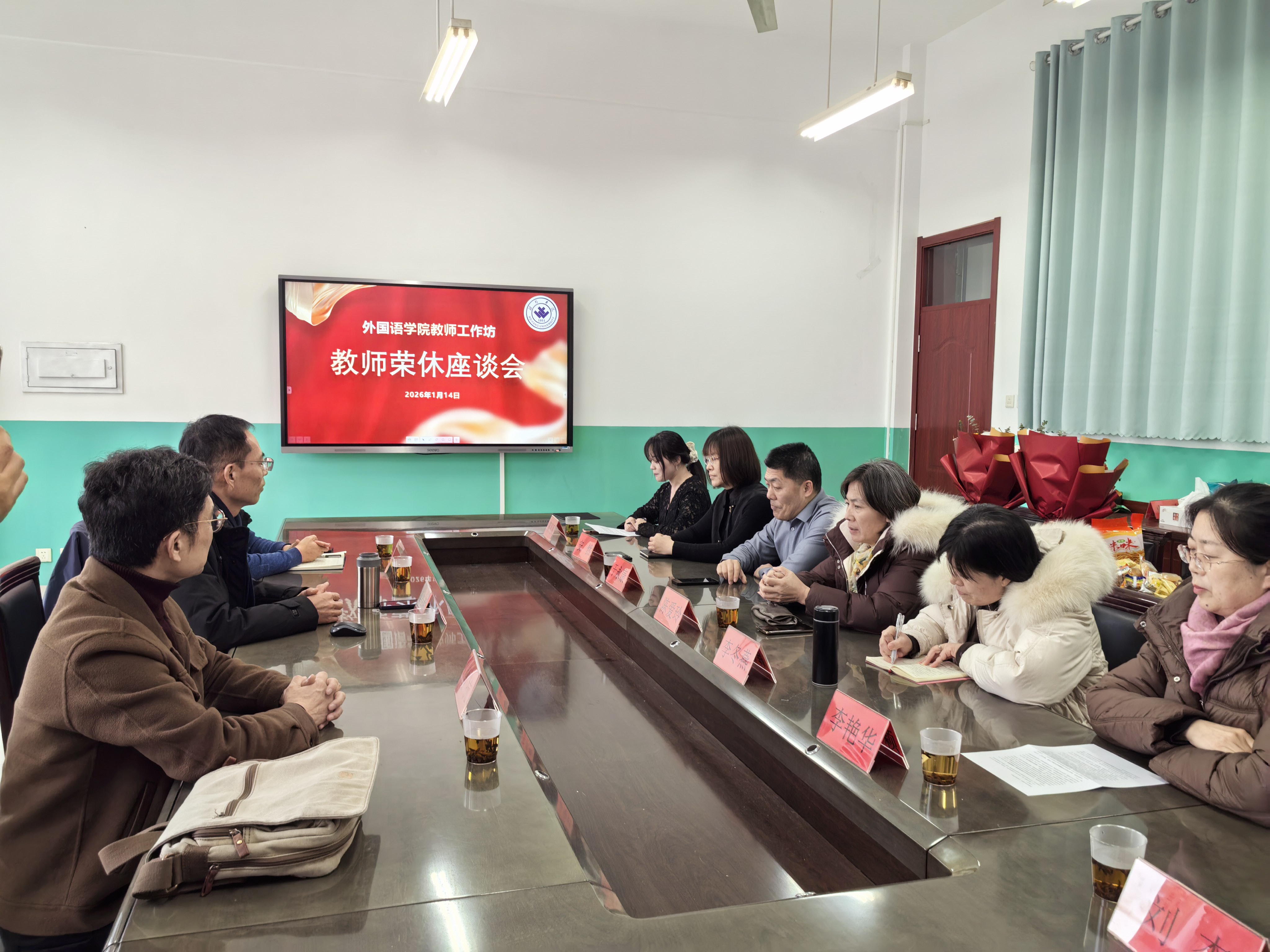 2026年1月14日下午,外国语学院教师工作坊为曾抗、朱瑞利、耿德芳三位教师举办荣休座谈会。学院院长张学祥、教师代表与荣休教师齐聚一堂,共话教育情怀。