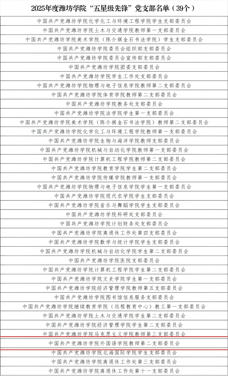 近日,中共潍坊市委教育工委公布2025年度“五星级先锋”党支部名单,我院教师第二党支部成功入选,首次获得“五星级先锋”支部荣誉称号,学院连续两年有党支部获此殊荣。